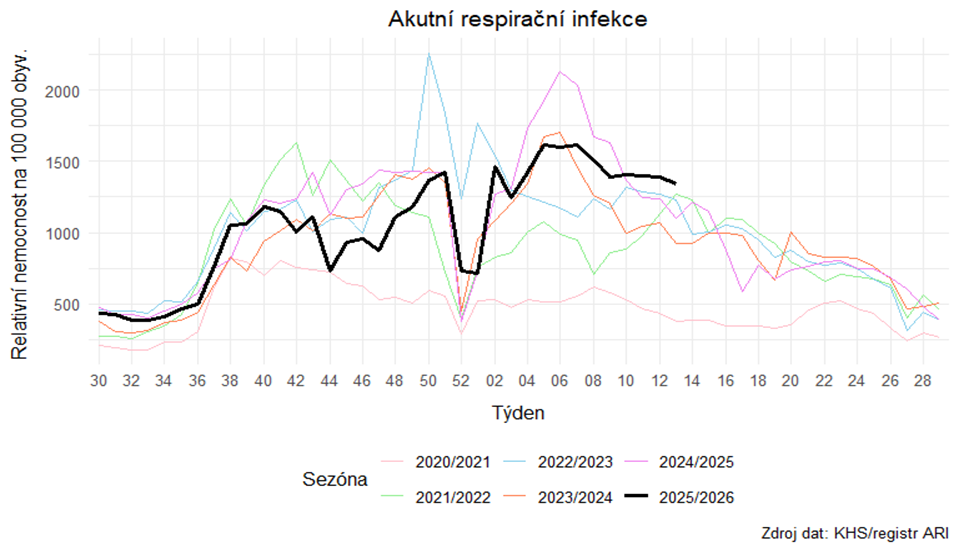 Ve 13. týdnu 2026 byla v Ústeckém kraji zaznamenána celková nemocnost akutními respiračními infekty na úrovni 1340 onemocnění na 100 000 obyvatel, což představuje pokles o 3,6 % oproti předchozímu týdnu. Nejvyšší nemocnost byla zaznamenána v okrese Litoměřice a ve věkové skupině 0–5 let. Mezi laboratorně potvrzenými původci akutních respiračních onemocnění dominují RS viry. Epidemický práh byl překročen v následujících okresech: Litoměřice, Teplice.