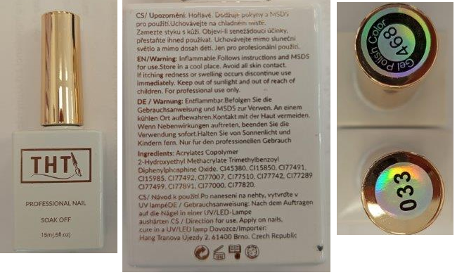 Domov » Nebezpečné výrobky » Nebezpečný výrobek – THT, PROFESSIONAL NAIL SOAK OFF, 15 ml, 362, 376, 033, 468 (Gel Polish Color)